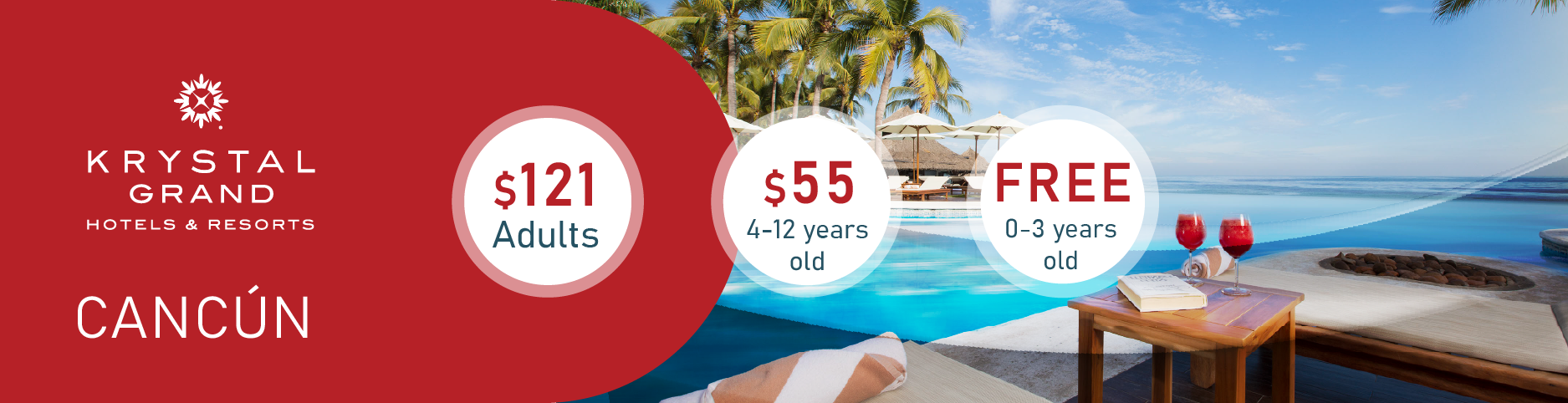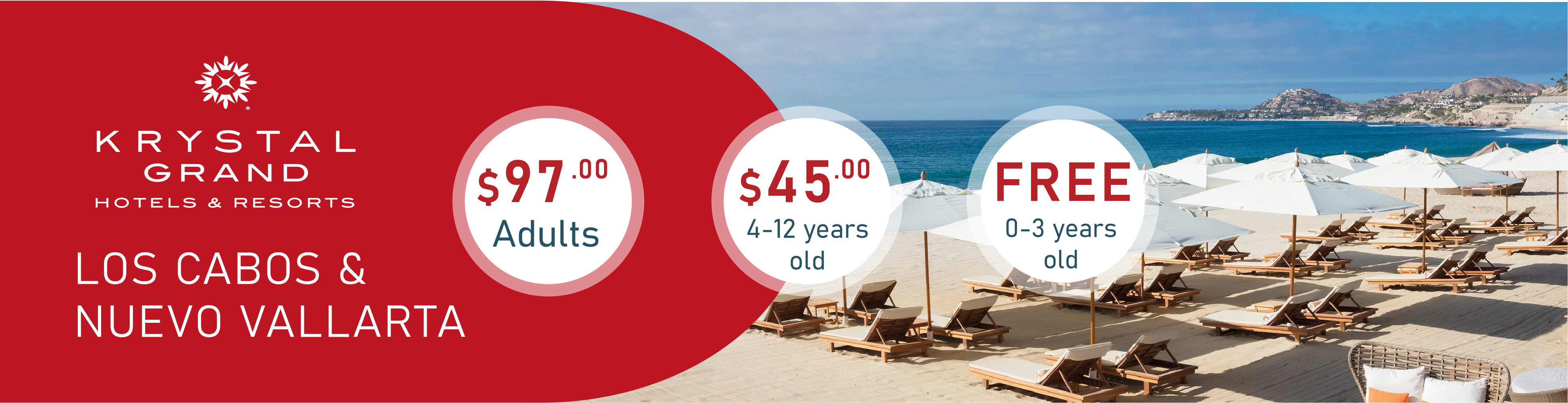 This program is exclusive at the Krystal Grand resorts in Nuevo Vallarta, Cancún and Los Cabos. What are you waiting for? Call now from Canada and USA at 888 422 1552 or in Mexico at 800 953 0874 and reserve and pay instantly. Or email us: reservations@belairownerscircle.com